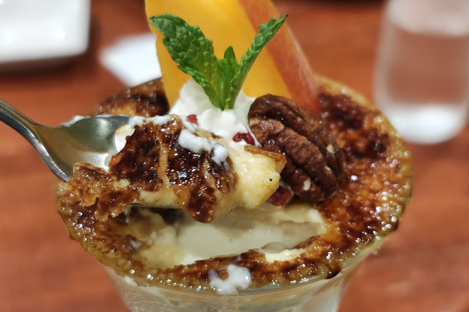 器にフタをするようにキャラメリゼされたクレームブリュレを崩していくと、ピーカンナッツや角切りのアップルマンゴーが現われる。バニラアイスやホイップクリームの層を挟んで、中間あたりではパインソルベとマンゴーアイスのトロピカルなハーモニーを味わえる。最後は爽やかなライムジュレとアップルマンゴーの組み合わせで、パフェ全体の構成としては、下にいくほどさっぱりとした味わいになっていくため、重さを感じず後味がよい。