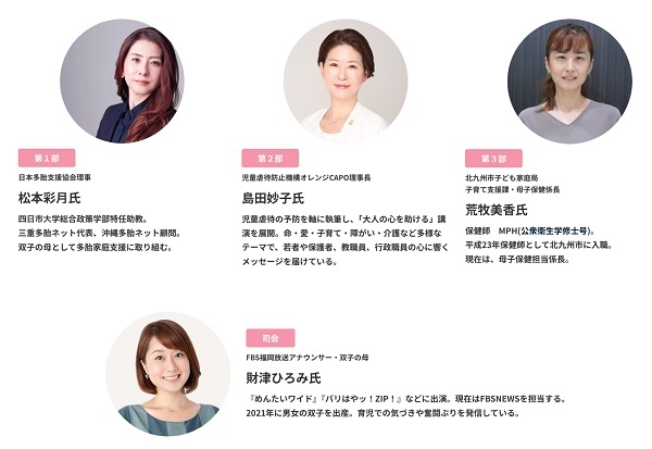 イベントの登壇者は、日本多胎支援協会理事の松本彩⽉氏、児童虐待防止機構オレンジCAPO理事長の島田妙子氏、北九州市子ども家庭局 子育て支援課・母子保健係長の荒牧美香氏。司会は、FBS福岡放送アナウンサーで双子の母でもある財津ひろみ氏が務める。
