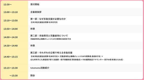 「多胎シンポジウム in Fukuoka 2025」の開催時間は13:00〜15:00(12:30受付開始)。参加費は無料。事前申込制で、申込は公式サイトにて受付中だ。定員は692人(車いす専用席7席)。当日の様子は、tatamamaのYouTubeチャンネルにてLive配信予定となっている。