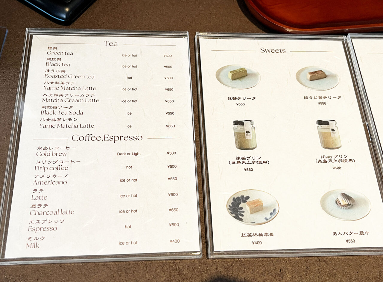 ドリンクメニューには、Niwaオリジナルブレンド豆を使ったドリップコーヒーやコールドブリューなど、お茶と珈琲の個性を引き出したドリンクを幅広く提供。コーヒーのほか紅茶や緑茶、ほうじ茶といったお茶メニューも充実しています。