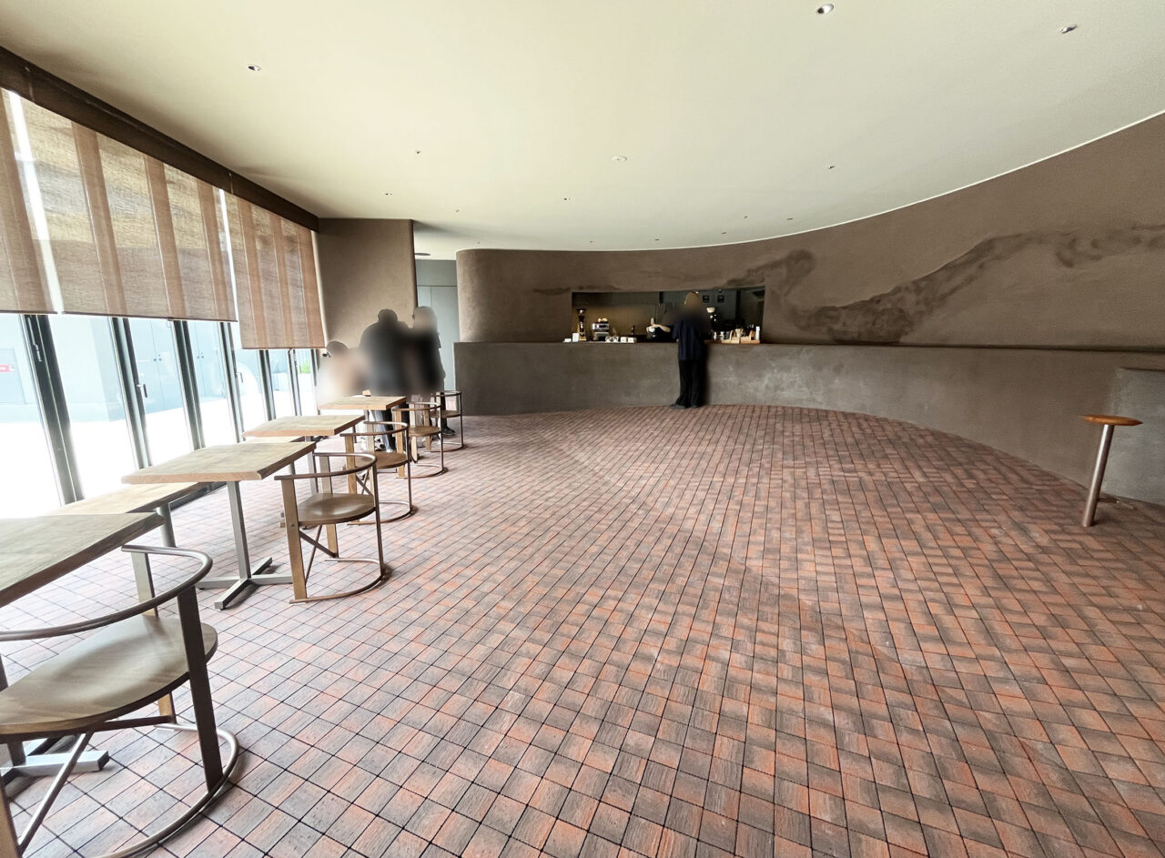 広場で遊ぶお子さんが多いということで、カウンター前には広いスペースを設けているということです。カフェカウンター前の床には高低差による空間の奥行きを演出された、丘を登るような緩やかな傾斜で不思議な空間となっていました。