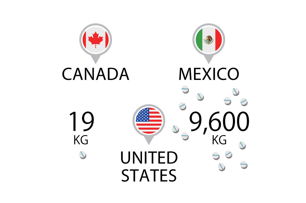 トランプ氏はカナダとの国境で押収された量だけで950万人ものアメリカ人が殺されてしまうと発言しているが、2024年度にカナダとアメリカの国境で押収されたフェンタニルは19キログラム。メキシコとアメリカの国境で見つかった9,600キログラムのわずか1%にも達さない量だった。