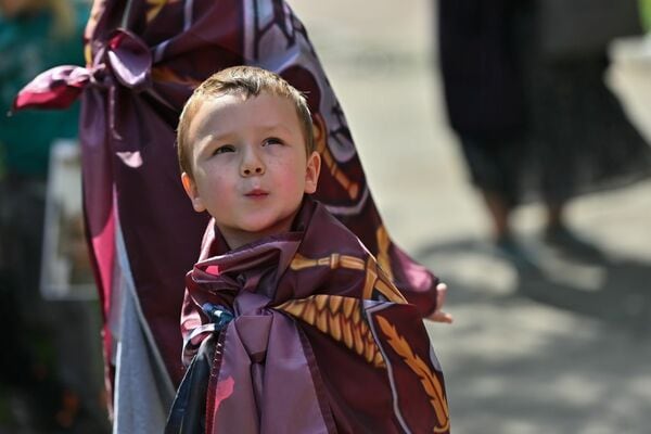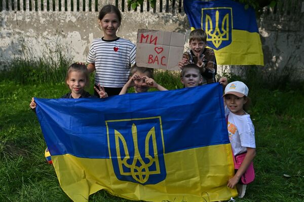 ウクライナ国旗をまとった犬も、主人を迎えに来ていた
