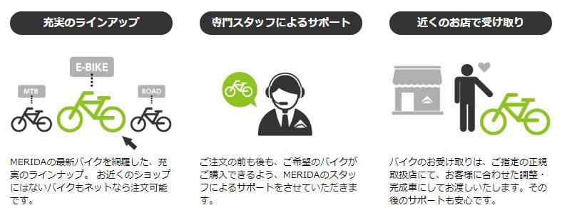 『ショップへ何度も見に行く時間は取れないが、使い方や乗り方が不安なので、最終的にショップで受け取りたい。』などといったユーザーのご要望にお応えし、バイクを直接ユーザーがオンラインサイトで注文し、MERIDA PARTNER SHOP や MERIDA ADVISORY SHOP 、 MERIDA GLOBAL DEALERにて受け取ることが可能なサービスです。