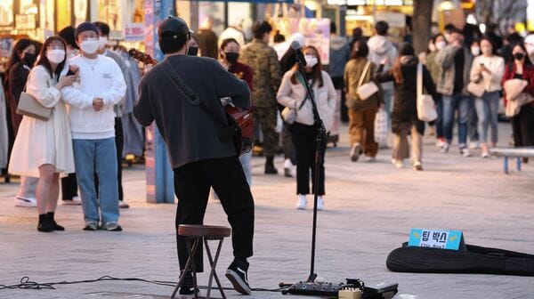 韓国ソウル市麻浦区の弘大地区で路上パフォーマンスをするアーティスト(資料写真、2022年11月31日、写真:YONHAP NEWS/アフロ)