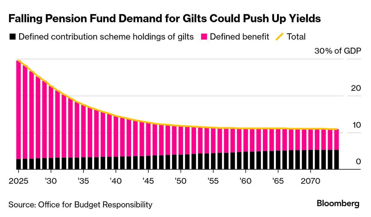 年金基金は国債の需要を支える重要な買い手だったが、確定給付型年金から確定拠出型年金への移行に伴い、長期国債を保有し、長期運用する必要性が薄れたことも、大きな脅威だ。英国債の借り入れコストを押し上げ、外国人投資家への依存度が高まる可能性が高いとOBRは分析した。
