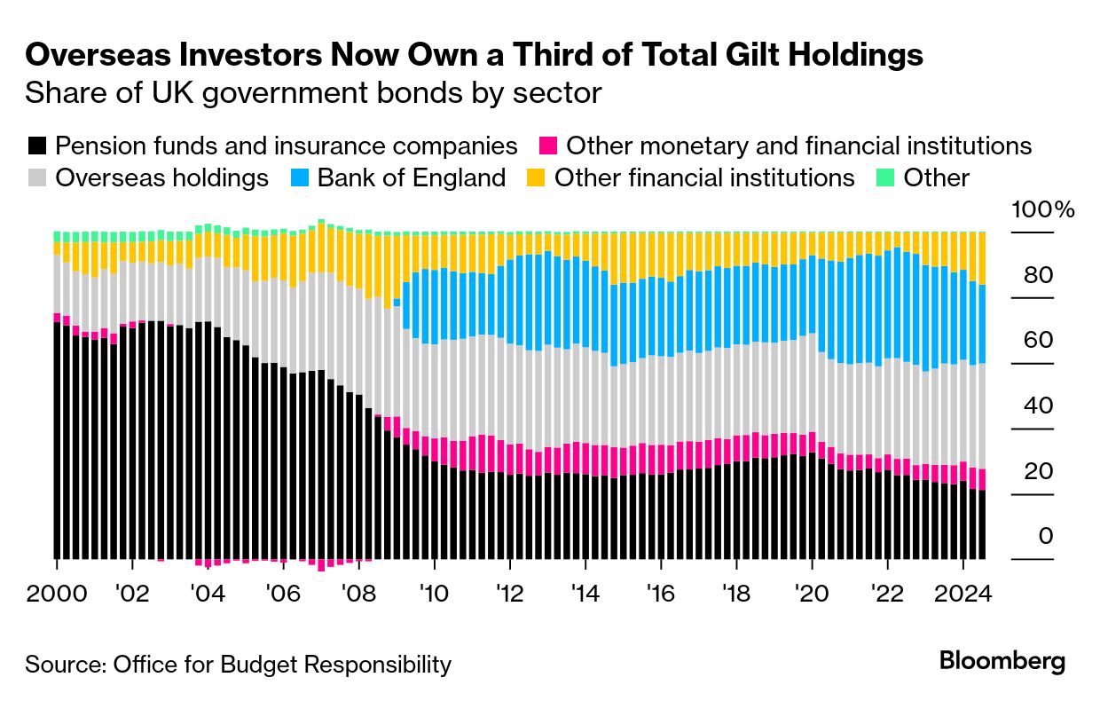イングランド銀行(英中央銀行)も量的緩和(QE)で買い入れた英国債の保有圧縮に動いており、年金基金の運用構造の変化を受け、英政府は市場心理が不安定な時期に国債の購入を海外の投資家に依存せざるを得ない。
