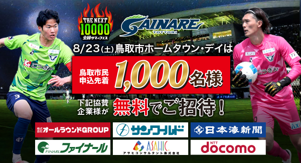 鳥取市ホームタウン・デイとして開催する8月23日(土)松本山雅FC戦にて、鳥取市民の皆さまを対象に先着1,000名様をホームゲームへご招待いたします!本招待企画は、協賛企業各社様のご支援により実施するものです。