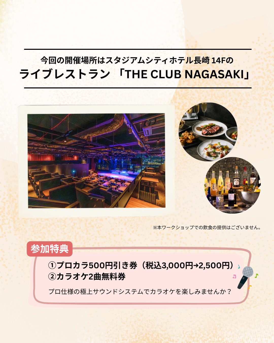 さらに!ワークショップ参加者様には、THE CLUB NAGASAKI で期間限定でカラオケが楽しめる「プロカラ」のお得な500円引き券 & カラオケ2曲無料券をプレゼント🎁🎤