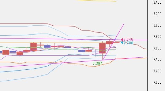 日足、雲中だが2σ下限下抜きから一気に上限まで上昇。9月30日-10月6日の上昇ラインがサポート。10月4日-11月7日の下降ラインが上値抵抗。5日線が20日線を上抜くか。