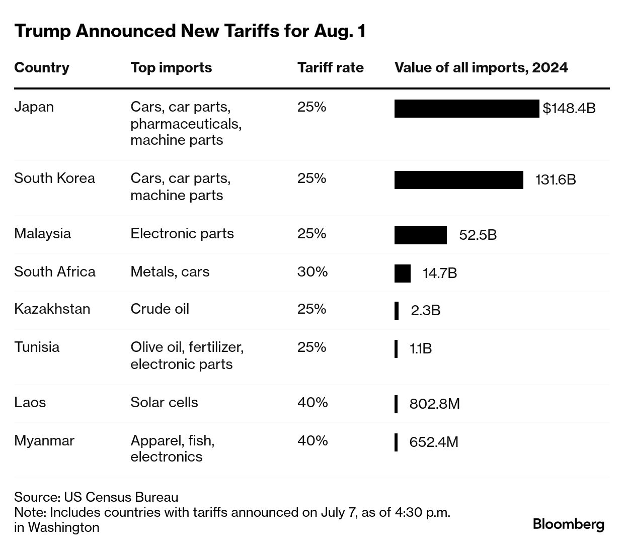 トランプ米大統領は7日、予告していた関税通告の第1弾を発表した。期限を8月1日まで再延長した上で、同日から適用する関税率は日本と韓国、マレーシア、カザフスタン、チュニジアが25%、南アフリカ共和国が30%、ラオスとミャンマーが40%などとした。