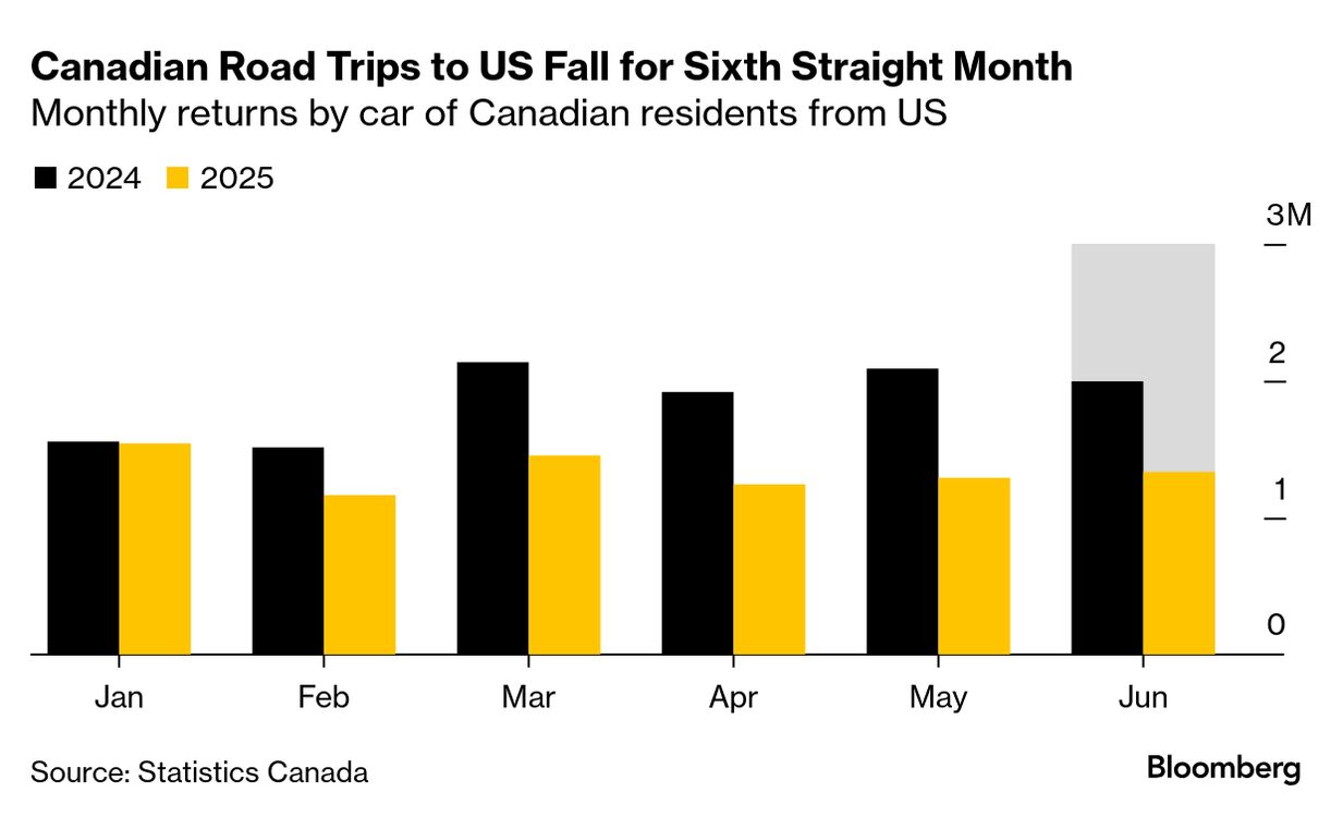 カナダ統計局が10日公表したデータによると、上期にカナダ居住者が米国から自国に戻った件数は800万件にとどまり、前年同期の1100万件を大幅に下回った。減少は6カ月連続。