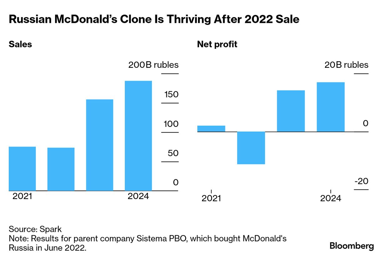 フクースナは2022年6月にマクドナルドのロシア事業をわずかな額で買収して以降、事業は好調で、今では1日の来客数が200万人、1年で50以上の新店舗を開店した。親会社システマPBOの売上高は2倍以上に増加し、利益は8倍に跳ね上がった。