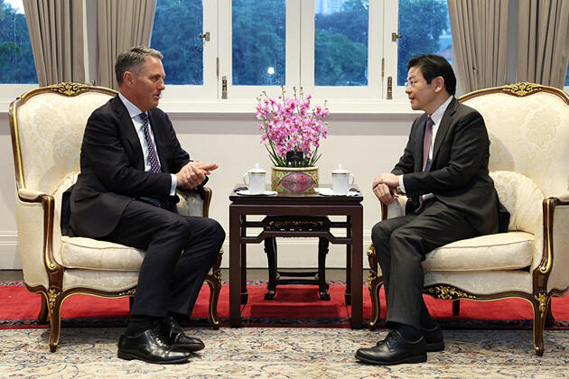 6月に2025年シャングリラ会合に出席したオーストラリアのリチャード・マールズ(Richard Marles)副首相(左)とシンガポールのローレンス・ウォン(Lawrence Wong)首相
