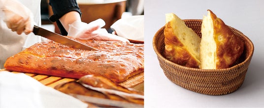 元来パスタに用いられるデュラム小麦と微粉砕された小麦粉を組み合わせ、オリーブオイルをふんだんに使用し焼き上げたフォカッチャは、ふわふわしっとりの食感です。料理やお酒とのマリアージュをお楽しみいただくために、敢えてシンプルな配合に「こだわらない事にこだわる」「毎日でも食べたい」を考えながら作りました。