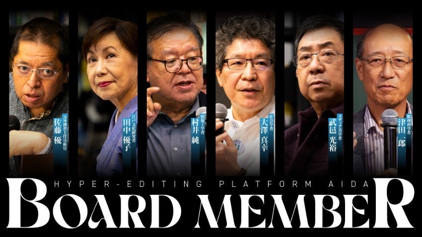 ボードメンバー。左から、佐藤優氏(作家・元外務省主任分析官)、田中優子氏(法政大学名誉教授・江戸文化研究所)、村井純氏(情報工学者)、大澤真幸氏(社会学者)、武邑光裕氏(メディア美学者)、津田一郎氏(数理科学者)。