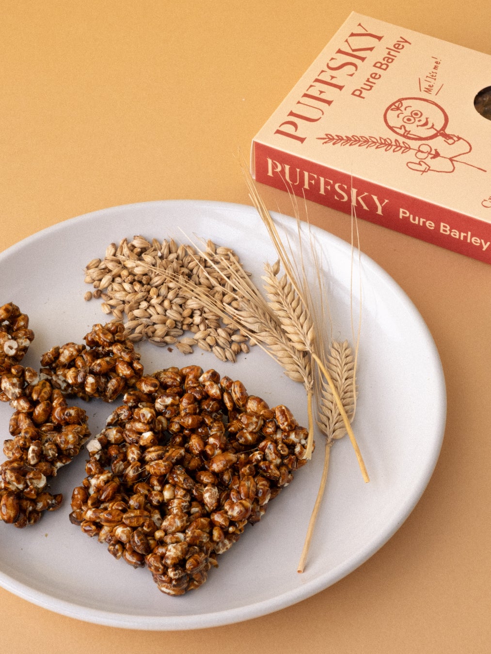 〈PUFFSKY (パフスキー)〉は、ウイスキーづくりの過程から生まれた麦のお菓子です。香川県産の大麦をふんわりとパフに仕上げ、麦芽シロップでキャラメリゼ。ひとくち頬張れば、パリッと軽やかな食感とともに、麦本来のやさしい香りが口いっぱいに広がります。フレーバーは以下の3種類をご用意しました。