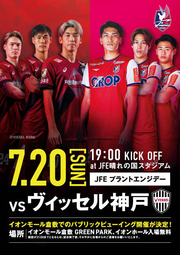 ホームで開催される7月20日(日)ヴィッセル神戸戦につきまして、イオンモール倉敷 GREEN PARK、イオンホールでのパブリックビューイングを実施することが決定いたしました。