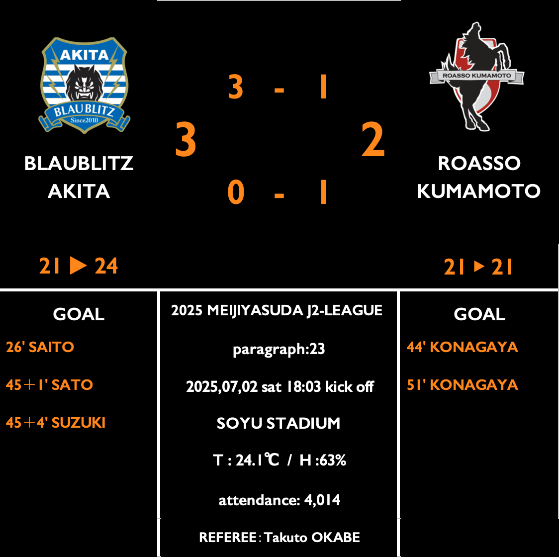 磐田を下した勢いのまま、連勝で同じ勝点21の秋田を突き放したかったゲーム。熊本はボール保持率やシュート数で相手を上回ったが、前半終了間際の2失点が響いてスコアをひっくり返すにはいたらず、思惑とは逆に勝点差を広げられる格好で敗れ、再び降格圏の18位に順位を下げた。
