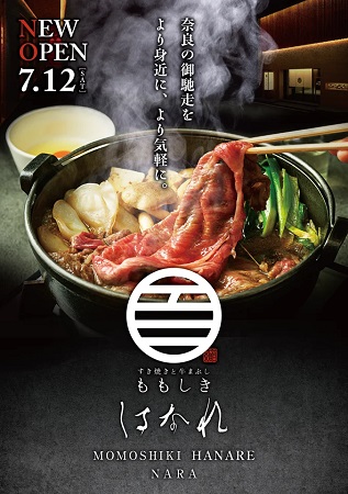 奈良県内に飲食店を6店舗展開する風神は、7月12日(土)、近鉄奈良駅から徒歩1分の立地に「すき焼きと牛まぶし ももしき はなれ」をオープンした。