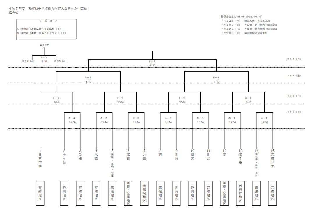 ・トーナメント方式とし、3位決定戦は行わない。ただし、令和7年度は全国中学校サッカー大会が本県開催のため、最終日に3位同士による代表候補決定戦を行う。