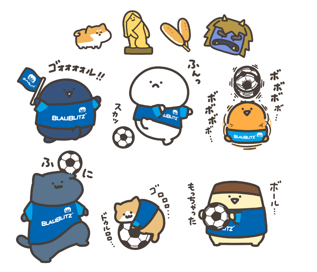 キャラクターたちが、ソユースタジアムでブラウブリッツ秋田のプレイヤーとして、サッカーボールと戯れる姿が「お文具といっしょ」の世界観でかわいらしく表現されています。