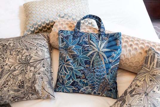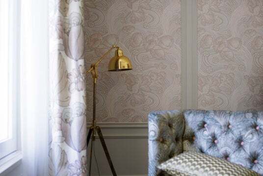 リバティ・ファブリックスのデザインを彩ってきた、孔雀モチーフのヘリテージ・アイコン「HERA」(ヘラ)を、ベッドスローとアームチェアーに。カーテンと壁紙にはブラッシュピンクをカラーテーマにした柔和で洗練されたデザインをセレクトし、温かみのある印象に仕上げています。