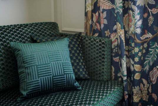 「JADE」(ジェイド・翡翠)をベースカラーに花や植物を大きく表現したカーテンと壁紙が主役の客室。大小さまざまな幾何学模様をソファの張地やクッションに取り入れ、エキゾチックかつ重厚感をもたらします。