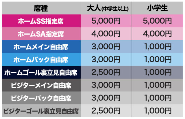 ※「ホームメイン自由席」「ホームゴール裏立見自由席」「ビジターメイン自由席」「ビジターゴール裏立見自由席」は立ち見席となります。