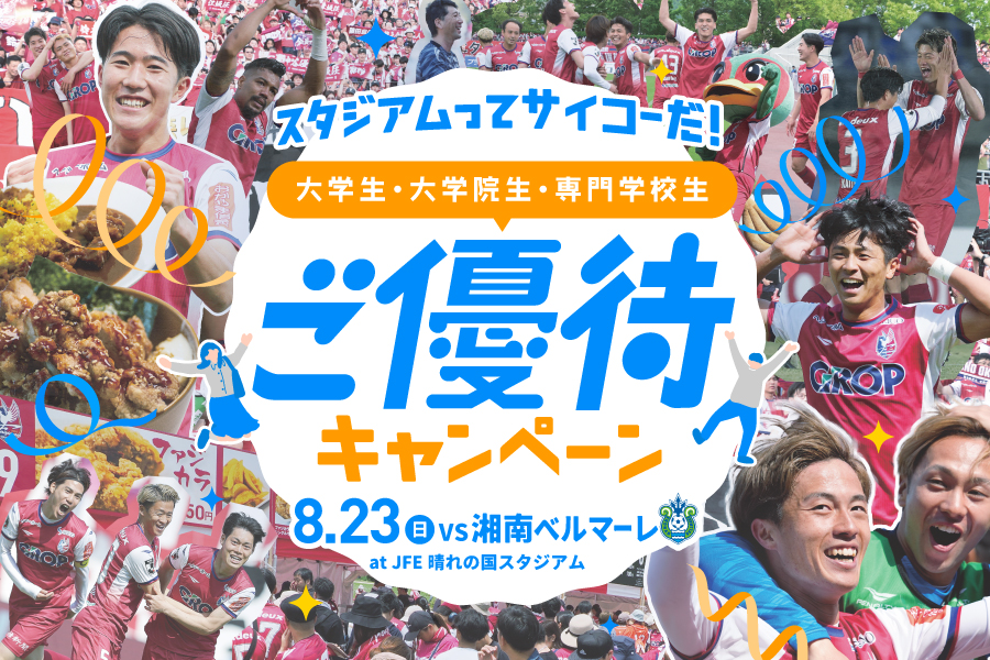 8月23日(土)に開催される湘南ベルマーレ戦では、岡山県内の大学、大学院、専門学校に通う学生の皆さまを対象に、優待チケットを販売いたします。