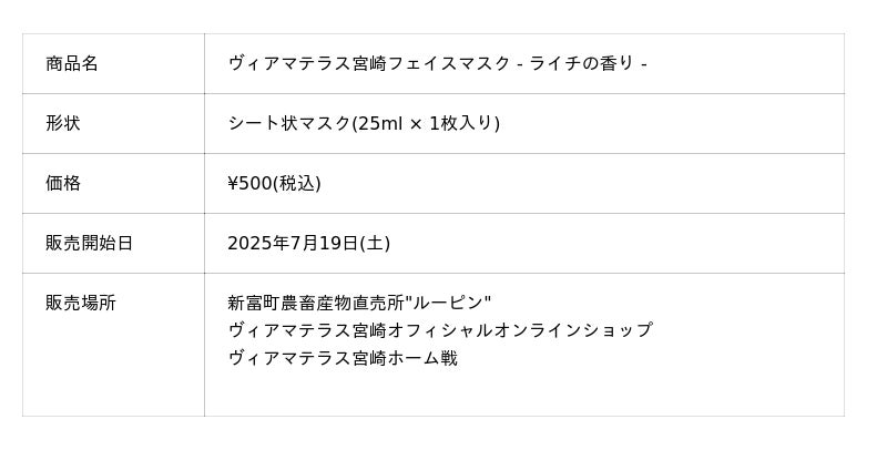 このフェイスマスクは、なでしこ1部リーグ女子サッカーチーム「ヴィアマテラス宮崎」の熱い想いと、新富町の特産品であるライチの魅力をかけ合わせて誕生しました。チームを応援する気持ちと、ふるさとの香りを肌から感じられる商品です。応援の熱気の中で火照った肌を、ライチの香りでそっと癒してください。