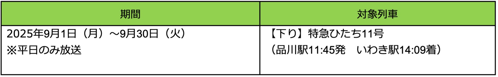 ・特急ひたち11号の車内放送は、「品川~勝田」「勝田~いわき」のそれぞれの区間で各1回のみ実施となります。