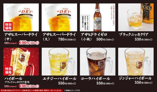 ※1 アサヒスーパードライ(大ジョッキ)、アサヒスーパードライ(キンキンタンブラー)は対象外。※2 コーラハイボール、ジンジャーハイボール、エナジーハイボール、リンゴ酢ハイボールは対象外。※3 ジャンボジョッキde黒ウーロン茶は対象外。ドリンクバー店舗はソフトドリンク各種の値引販売は実施いたしません。