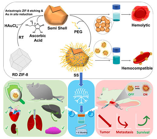 Illustration of semi-shell formation using rhombic dodecahedron (RD) shaped ZIF-8 as a sacrificial template and its PEGylation-assisted blood compatibility, cryopreservation, systemic safety and on-demand reconstitution towards pronounced photothermal therapy of advanced cancer.