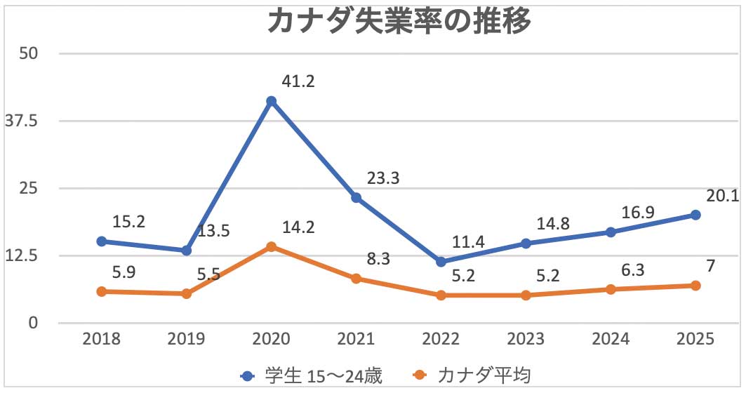 カナダは若者の失業率が高く、カナダ統計局によると、2025年5月の15〜24歳既卒者の失業率は12.2%*で、1990年代以来の高水準です。こちらも高水準のカナダ平均7%と比較しても、かなり高くなっています。同じ年代の学生の失業率は20.1%に達し、彼らは3か月の夏休み中に、飲食業やサマーキャンプで働いて学費の補填をすることが今までの主流でしたが、近年は事情が違っています。