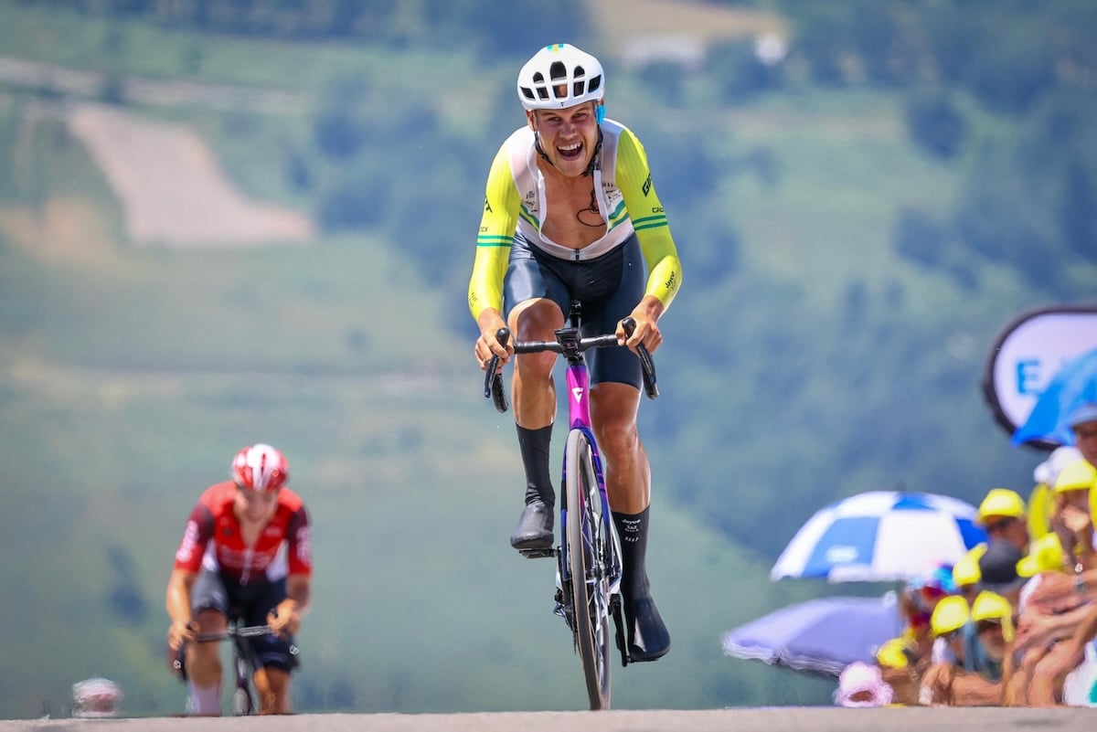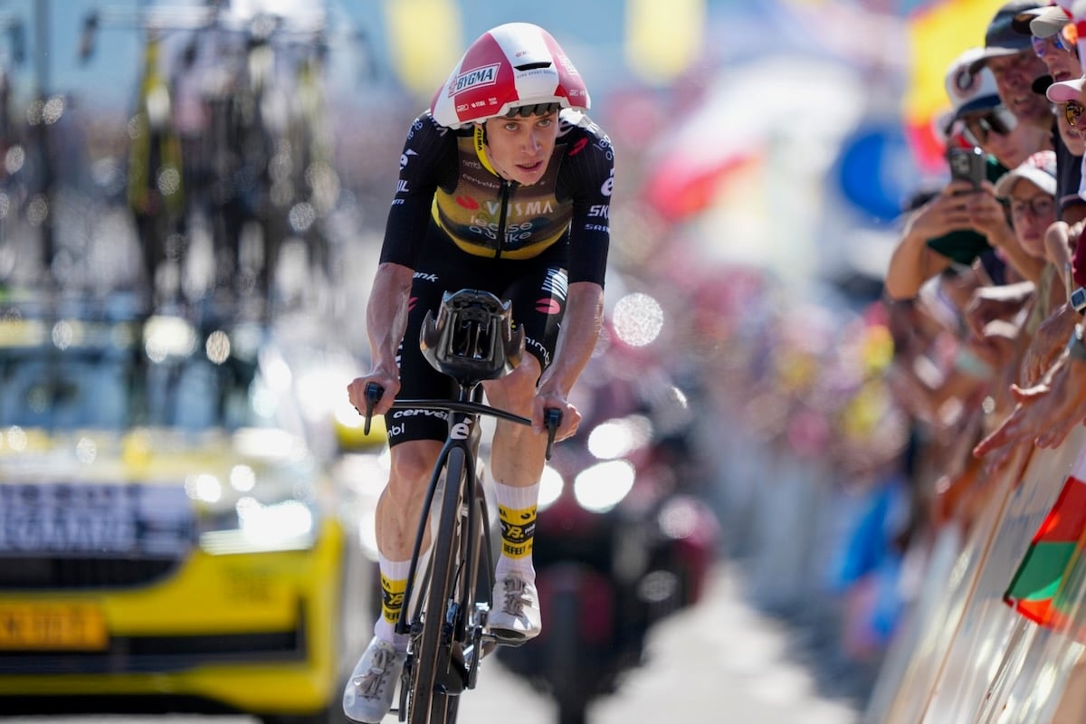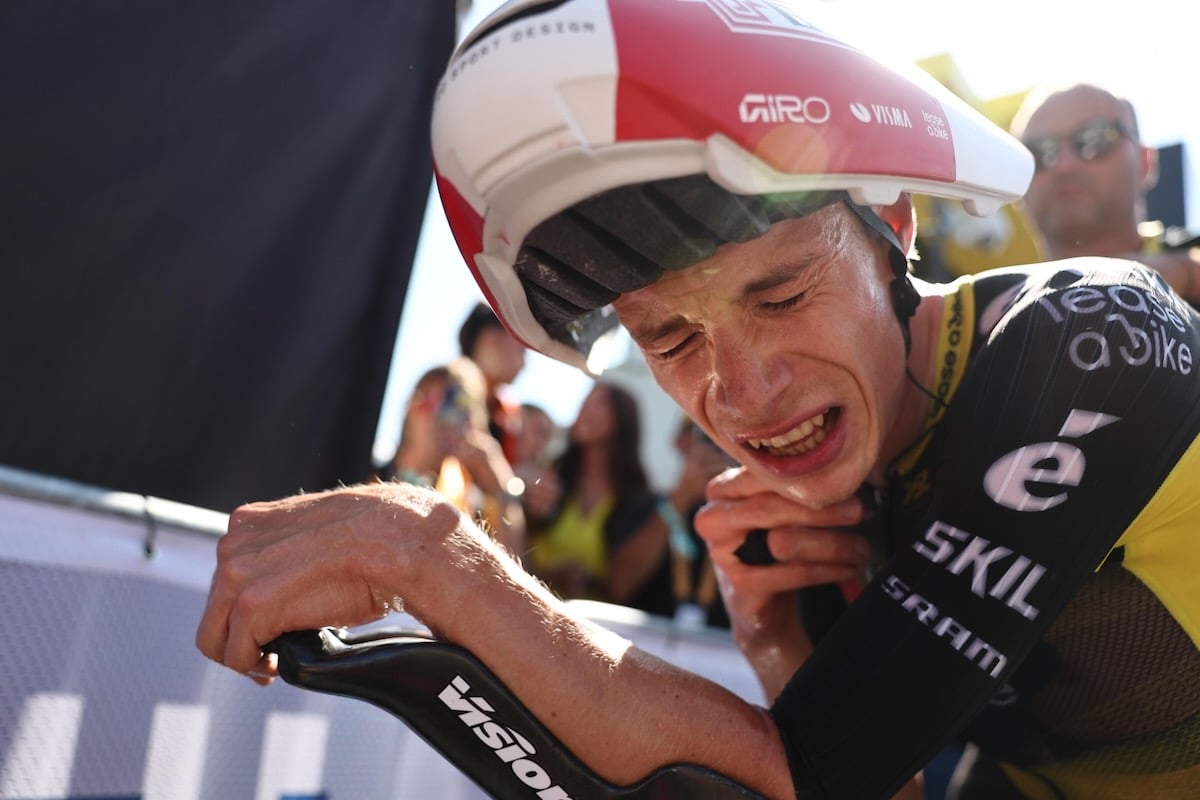 対照的に、圧巻の走りを見せたのが総合2位から巻き返しを狙うヨナス・ヴィンゲゴー(デンマーク、ヴィスマ・リースアバイク)だった。特徴的なフォルムのTTヘルメットとTTバイクでスタートすると、第2計測を暫定トップタイムで通過。軽快なダンシングを織り交ぜて終盤の激坂を駆け上がり、フィニッシュ手前50mで先行するエヴェネプールを追い抜くと、ログリッチのタイムを36秒更新するトップタイムを叩き出した。