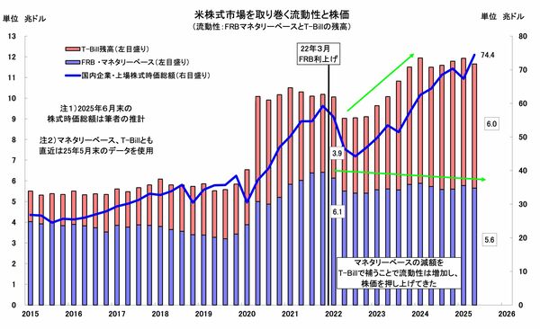 FRBが利上げを開始した2022年3月以降、マネタリーベースは0.5兆ドル縮小しましたが、その一方で、T-Billは2.1兆ドル増加しました。つまりFRBの金融引き締めにもかかわらず、一国全体の流動性は1.6兆ドル拡大し、その増加マネーの受け皿となった株式の時価総額は14兆ドルも膨らみました(図2)。