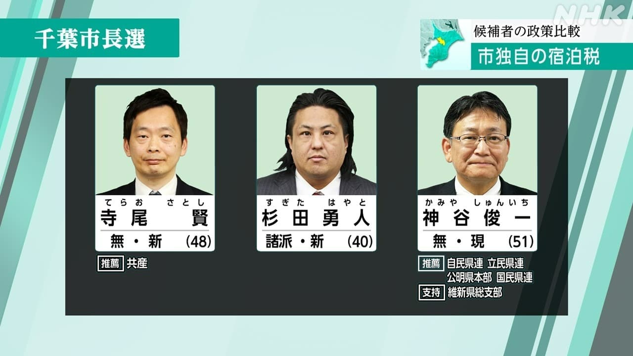 3月16日に投開票が行われる千葉県知事選挙の候補者の間では、宿泊税の導入について賛否が分かれています。千葉県知事選挙に立候補しているのは、届け出順にご覧のかたがたです。