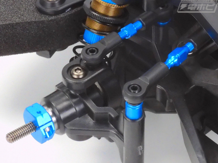 高性能なMシャーシ ビッグボアアルミダンパープラスを装備。上下のキャップをブルーアルマイト加工した専用品です。アッパーアームはターンバックル製で、クランプ式アルミホイールハブ(5mm厚)と強化フリーホイールアクスルを装備します。