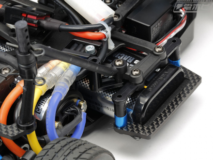 バッテリーホルダーは3mm厚のカーボン製で、走行中のバッテリーのガタつきを抑えるスポンジテープ付。シャーシはモーターをミドシップマウントして駆動輪となる後輪に荷重をかける構成。密閉式ギヤボックスにはリミテッドスリップ効果のあるボールデフを内蔵しています。