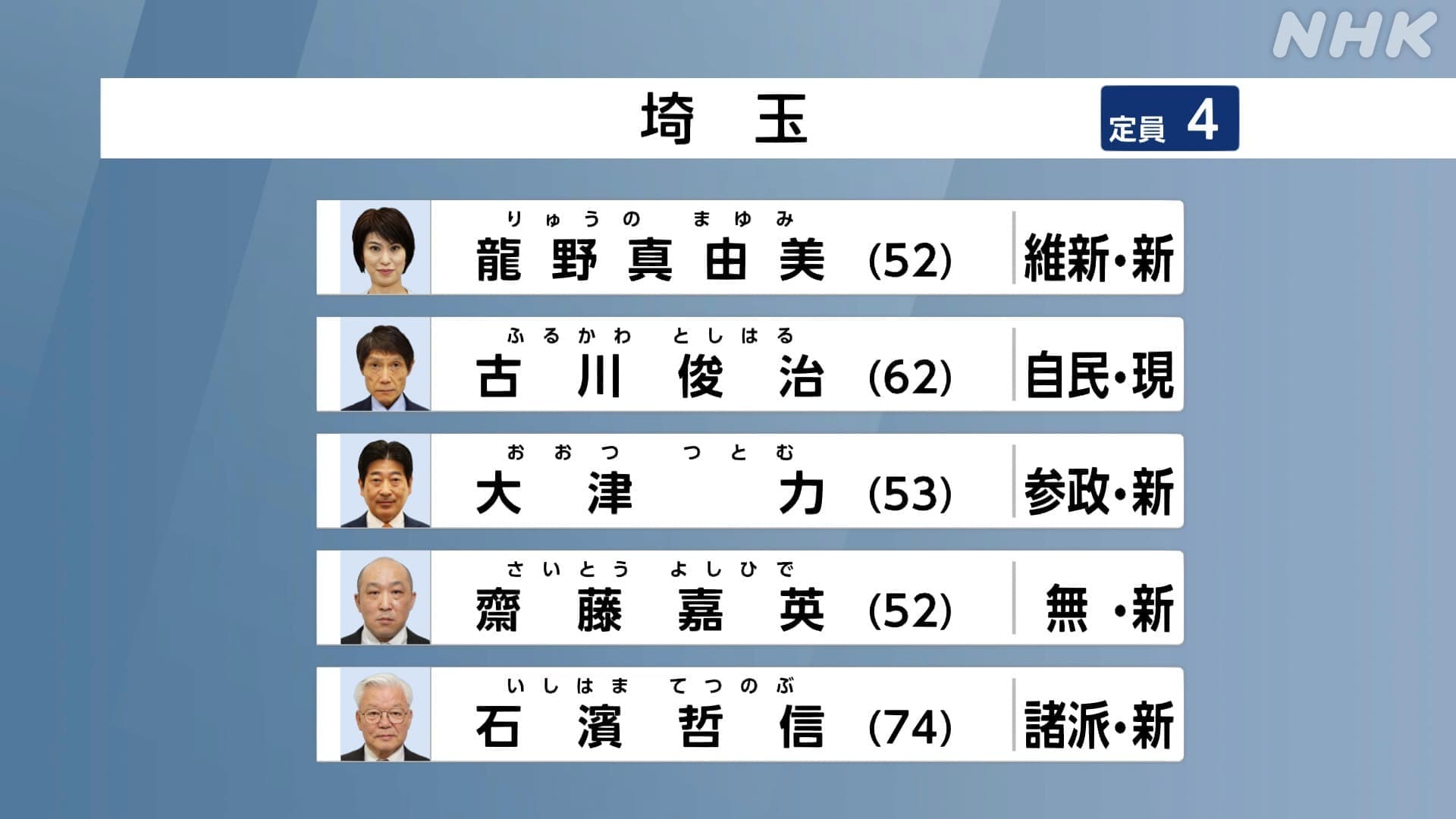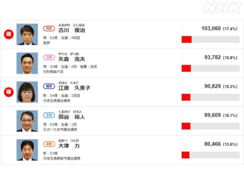 埼玉選挙区では、自民党の現職の古川俊治さんが4回目の当選を確実にしました。