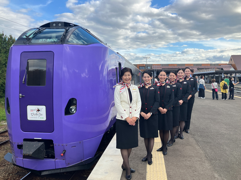 車窓から広がる北海道の雄大な景色や、その地域ならではの魅力を感じながら、列車の旅をお楽しみください。JALの空のおもてなしを列車内でも感じていただけるよう、心を込めておもてなしいたします。皆さまにとってこの旅が思い出深いものとなり、北海道とのご縁をさらに強めていただければ幸いです。ぜひ、広大な北海道を「ひとつの列車で、ひとめぐり」してみてください。