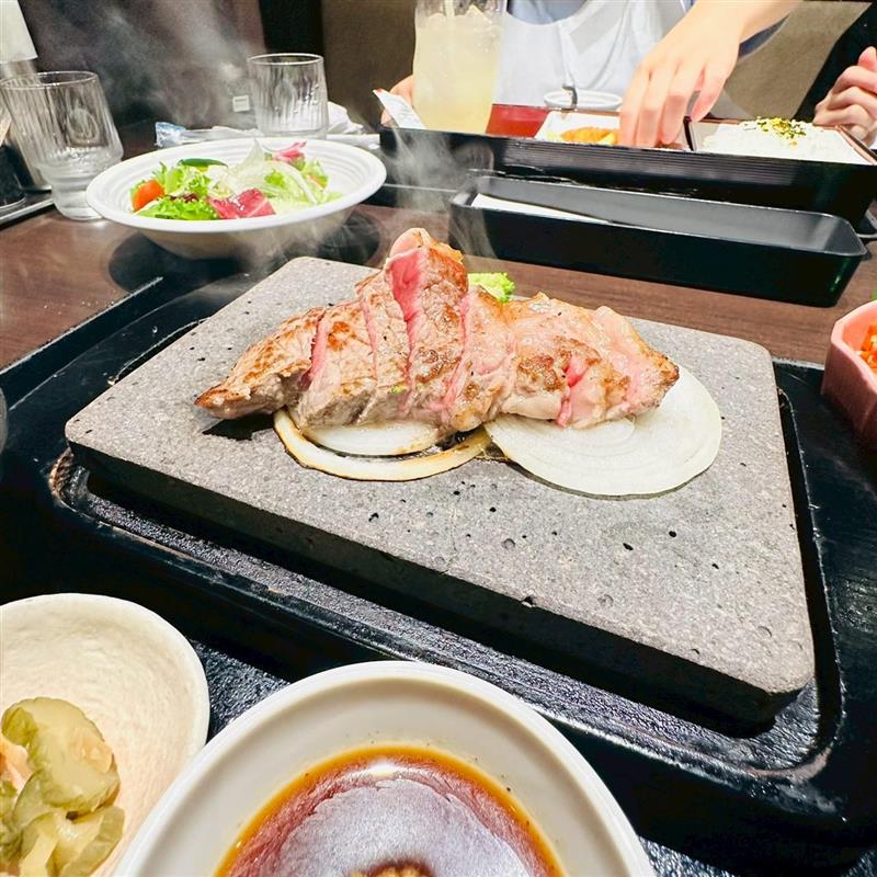 大人はこちら!熱々の石で焼きながら食べるステーキはたまりませんね✨️つけダレや、焼き石はおかわりできます😊