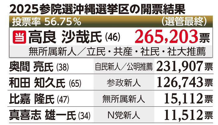 沖縄県選挙管理委員会は21日午前、第27回参院選の最終結果(開票率100%)を発表した。「オール沖縄」勢力から擁立されて初当選した無所属新人の高良沙哉氏(46)=立民、共産、社民、社大推薦=が26万5203票を獲得した。