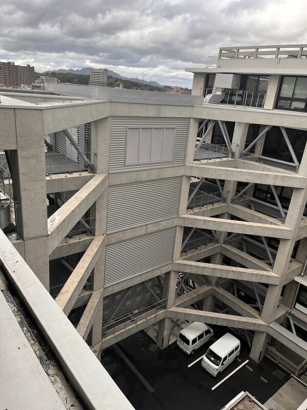 建物の間をつなぐ場所に放射線防護の機器が収められている(写真中央部分。筆者撮影)