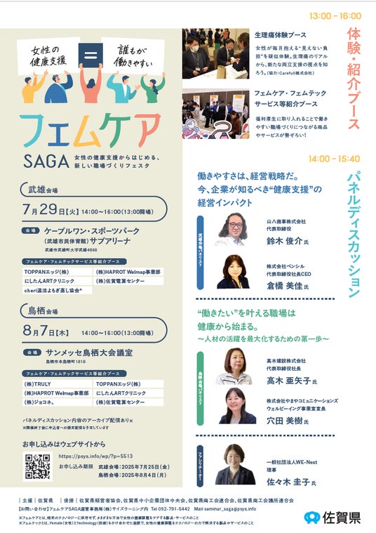 佐賀県では、月経や更年期など女性の健康課題に着目し、企業の働きやすさや生産性向上につながるヒントを提供する「フェムケアSAGAフェスタ」(以下、本イベント)を、2025年7月29日(火)に武雄市で開催します。本イベントでは、「働きやすさは、経営戦略だ。今、企業が知るべき“健康支援”の経営インパクト」をテーマに、健康経営や女性活躍を牽引する企業経営者2名が登壇し、実践的な取り組みを紹介。また、来場者が生理痛を疑似体験できるブースも設置し、企業内では見えづらい「健康と働き方の壁」への理解を促進します。