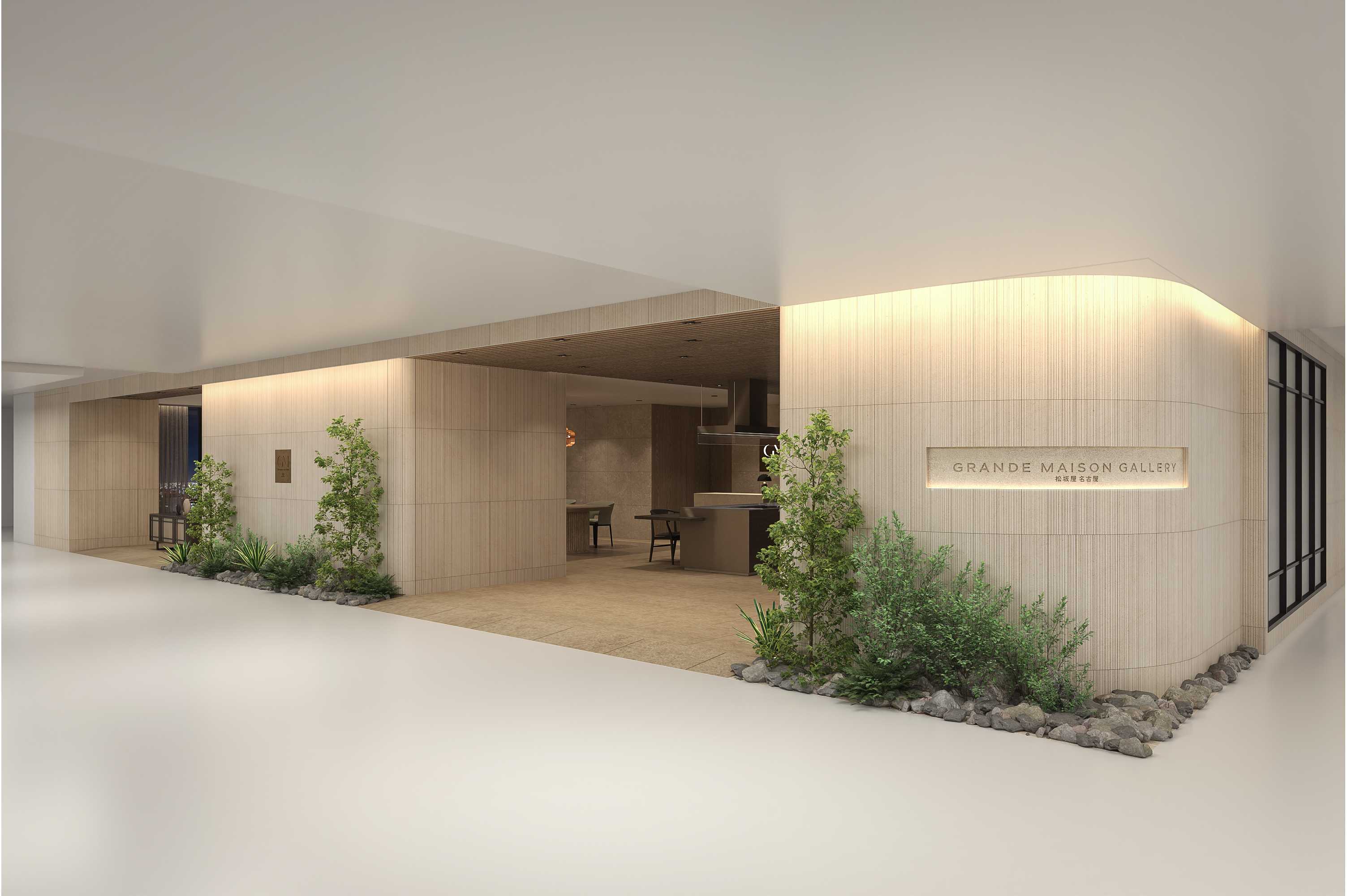 今回オープンするギャラリーは、従来のマンション販売拠点とは一線を画す空間設計がなされています。物件情報の提供にとどまらず、「”大人の知性と感性”を刺激するライフスタイル」をテーマに、ブランドの世界観に触れていただけます。ギャラリー内には、都心のタワーマンションをイメージしたコンセプトルームを設置。約40帖の広々としたリビング空間には、高天井や摩天楼の夜景を望むコーナーサッシを採用し、圧倒的な開放感と非日常的な上質さを演出しています。店舗外観には風合いのあるタイルを用いてクローズな門構えとすることで、重厚感と特別感を醸し出しています。