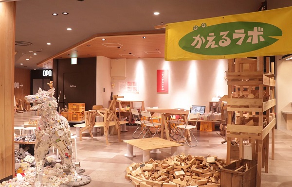 秋田市文化創造館の工作コーナー「ソウゾウカンラボ」と「かえっこ」発案者の美術家・藤浩志さんを中心とした「かえるラボ」がコラボレーションし、思いっきり工作できるコーナーに。つくるために必要な素材やアイデア、道具が揃っている。