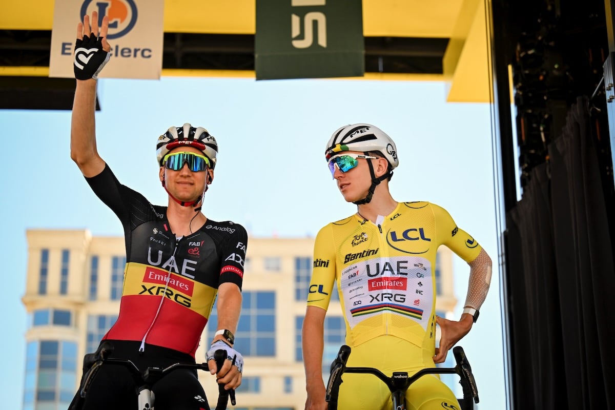 第15ステージを制したティム・ウェレンス(ベルギー、UAEチームエミレーツXRG)とマイヨジョーヌのタデイ・ポガチャル(スロベニア) photo:A.S.O.