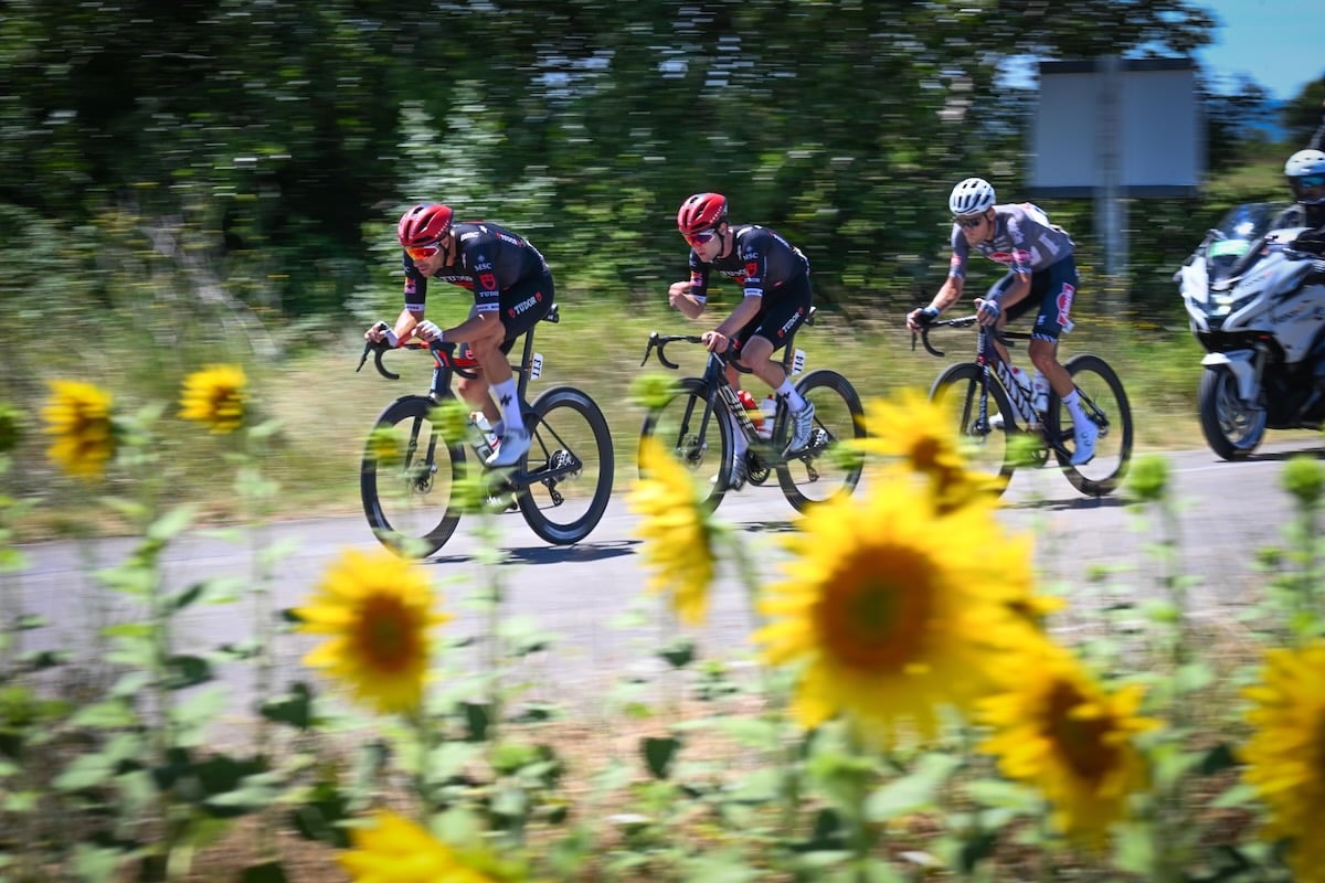 今大会7度目の逃げ切り勝利を目指すべく、2日前の「勘違いガッツポーズ」が話題となったジュリアン・アラフィリップ(フランス、チューダー・プロサイクリング)や6日目勝者ベン・ヒーリー(アイルランド、EFエデュケーション・イージーポスト)ら32名がこの日の逃げ集団を形成。平均時速50km/hに迫るハイペースで進むなか、残り65km地点でチューダー・プロサイクリングがペースアップを図ると、アラフィリップや第14ステージ勝者のテイメン・アレンスマン(オランダ、イネオス・グレナディアーズ)ら7名が抜け出すことに成功した。